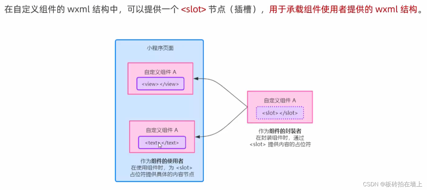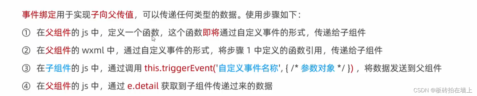 https://developers.weixin.qq.com/miniprogram/dev/framework/custom-component/wxml-wxss.html 章节中介绍。 - 事件:用于子组件向父组件传递数据,可以传递任意数据。