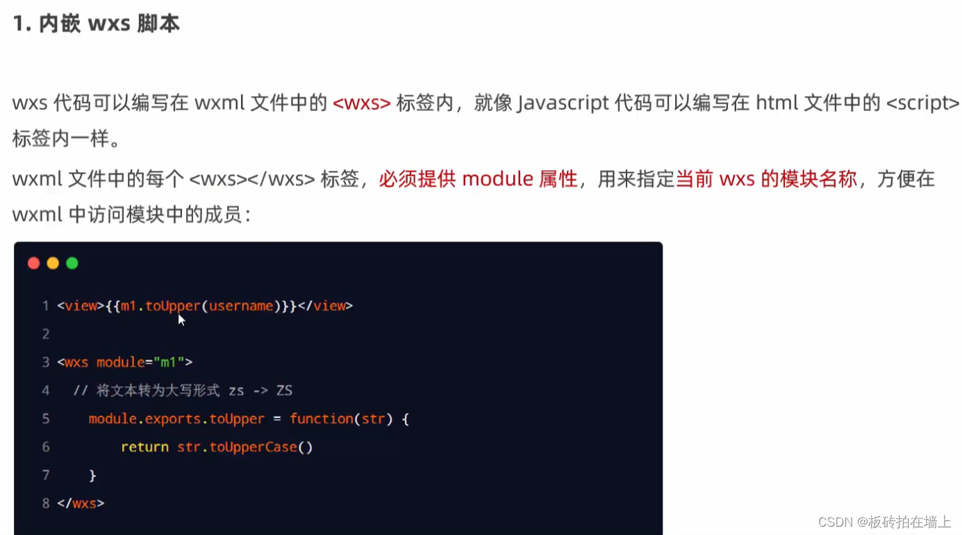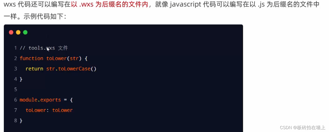 wxs 典型的应用场景就是“过滤器”,经常配合 Mustache 语法进行使用, 但是,在 wxs 中定义的函数不能作为组件的事件回调函数。例如,下面的用法是错误的:![]()