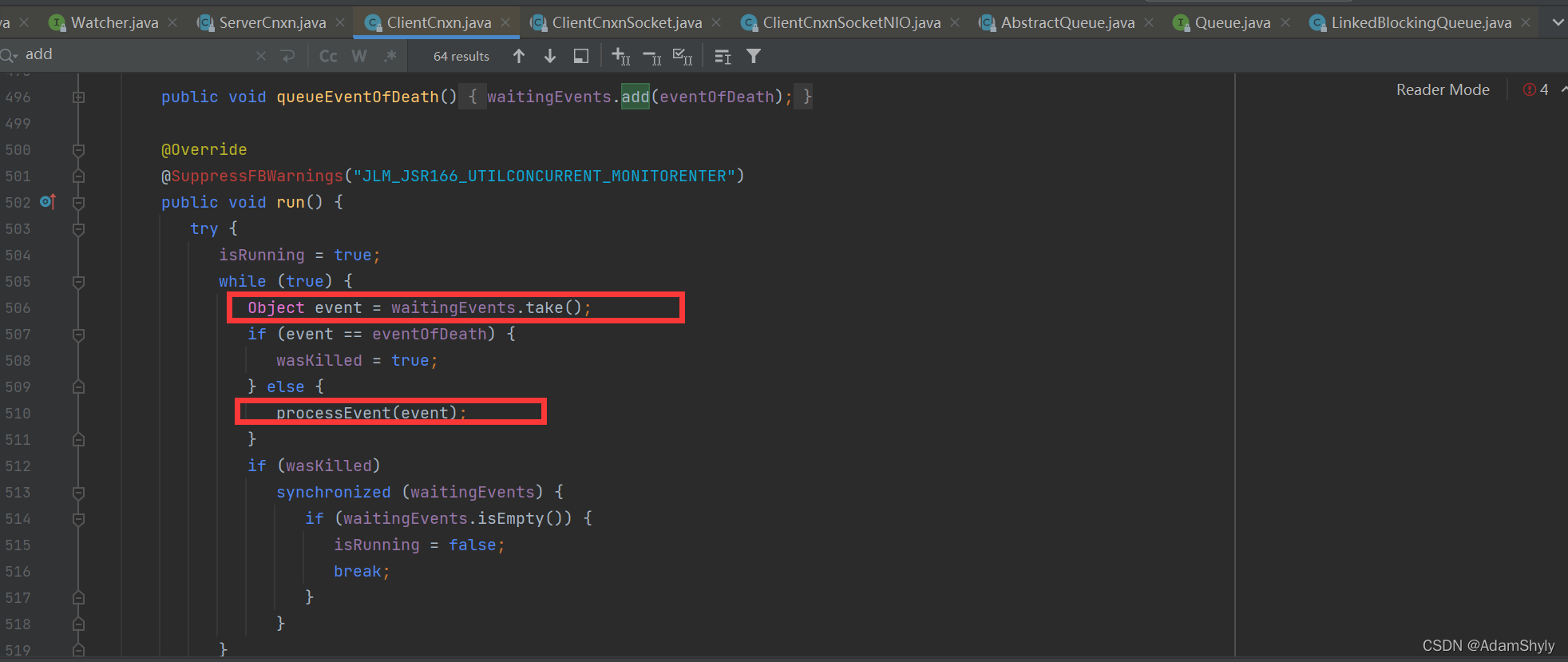 然后我对在ClientCnxn类中打了几个断点,调试后发现了waitingEvents队列,原来是在初始化ZooKeeper的时候将watcher和event封装为一个pair对象,然后add进waitingEvents队列