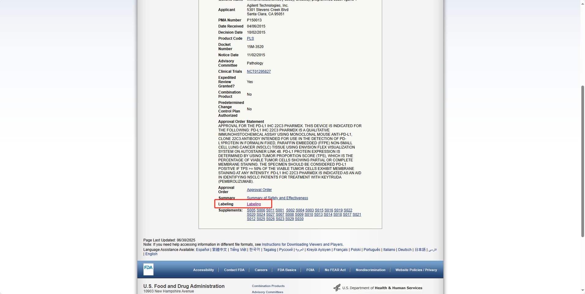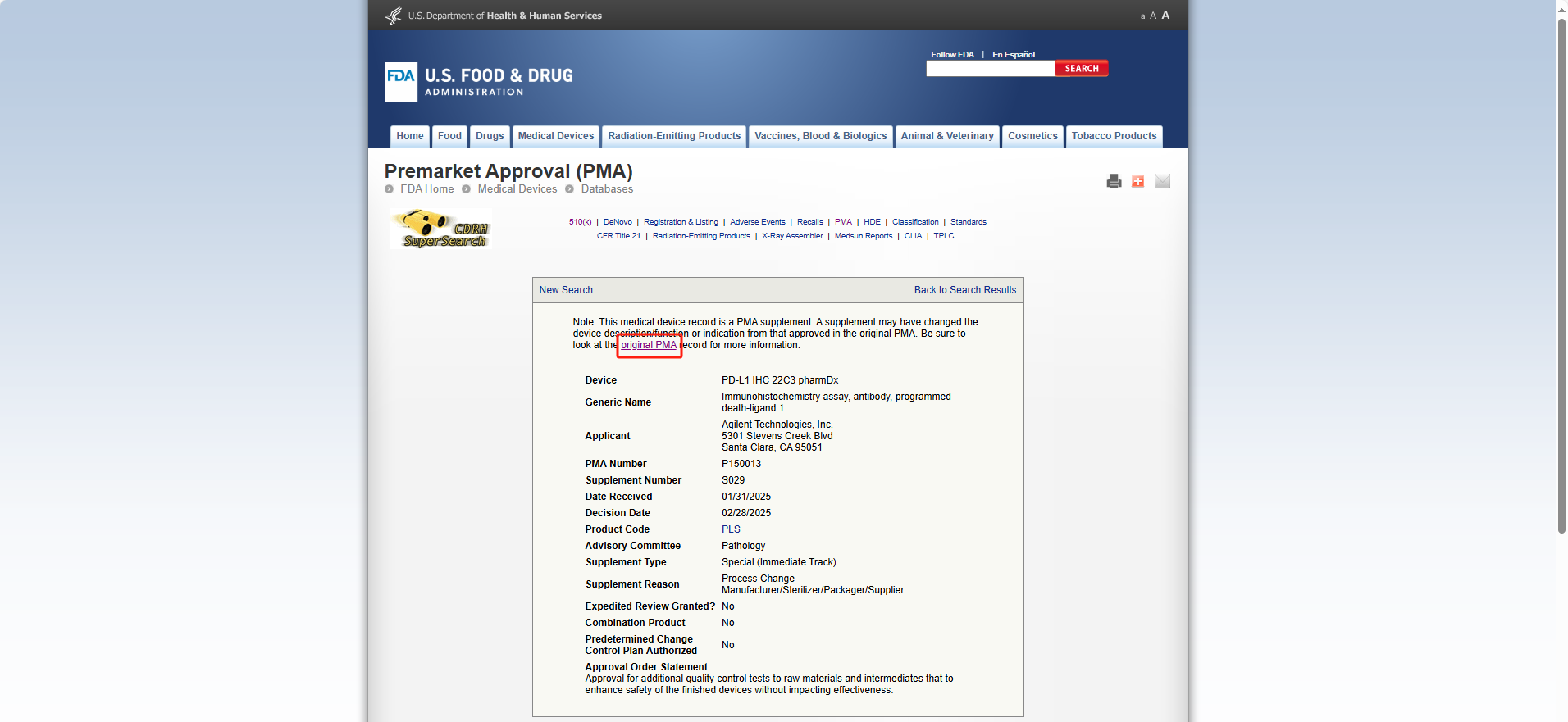 首先根据需求搜索需要查询的产品名称、厂家等信息,在结果页面选择具体产品,然后点击“Original PMA”,下拉并点击“Labeling"就可以下载产品说明书。