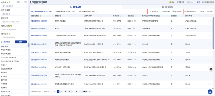 例如药智医械数据的上市器械筛选系统就可以一库查询全国医疗器械注册信息,其提供了近40种检索与筛选功能,为相关数据的检索筛选与分析提供极大便利性。
