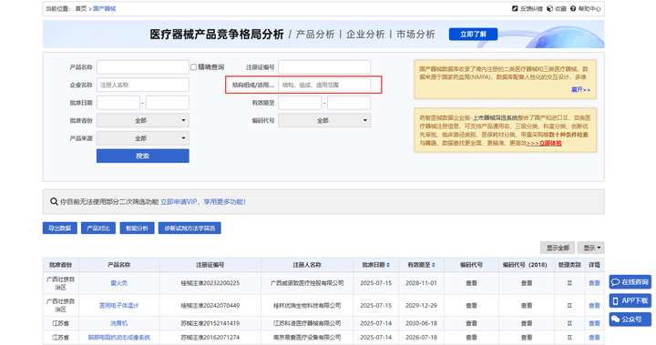 另外不管是国家药监局还是地方药监局官网,其医疗器械注册证查询功能都相对简单,较适合对单个产品、注册证、企业进行基础查询。如果要对批量数据进行分析,借助一些功能更加强大的第三方专业数据库则会事半功倍。