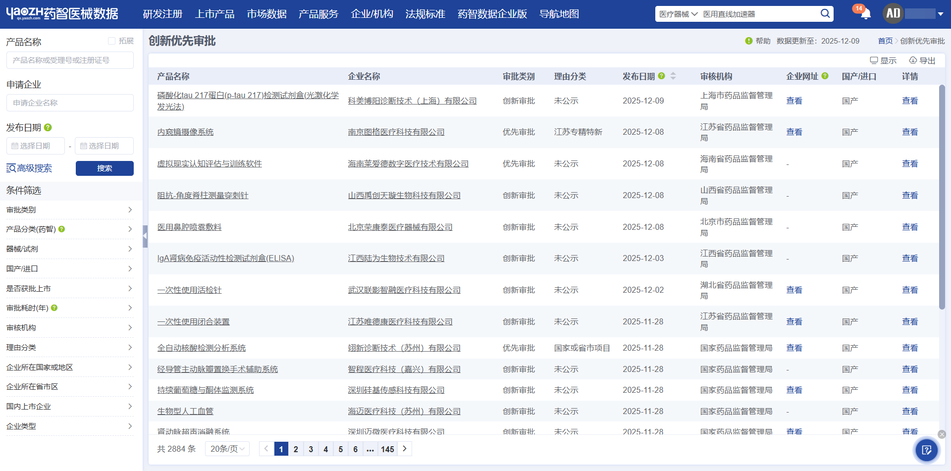 查询全国各省市医疗器械创新审批和优先审批信息,需根据审批机构和查询需求选择合适渠道:若对信息及时性要求很高,优先通过国家药监局(NMPA)、器审中心(CMDE)及各省市药监局官网查询;若需高效完成跨区域、批量筛选查询、批量导出,可选择药智医械数据企业版进行查询,节省检索时间。如果既希望一站查询全国信息,但只是简单查询产品或企业,且又不想付费,可以使用药智医械数据专业版免费查询。