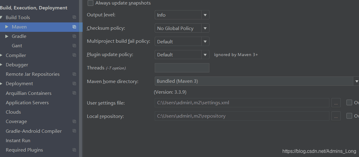 最后,在IDEA中配置Maven:点击File-Settings-Maven,Maven home directory不用写,自动会配置。只要将User settings file:设置成C盘中settings.xml存放的路径即可。完毕!
