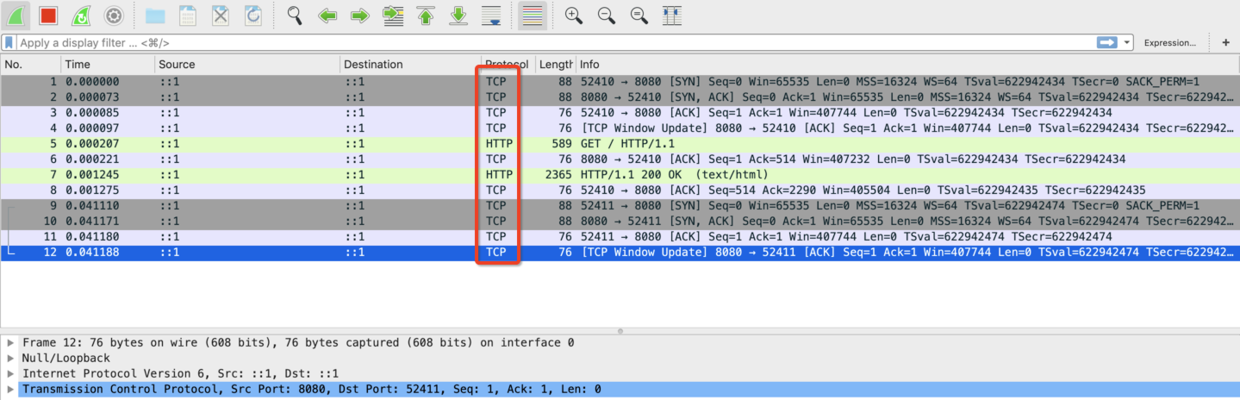 想看看浏览器输入URI后发生了什么事情的,可以在找我们的本机网络后,用wireshark监视着,再打开浏览器输入localhost:8080打开我们自己的Web服务器。这样我们就能很清楚的看到TCP的三次握手(如下图)