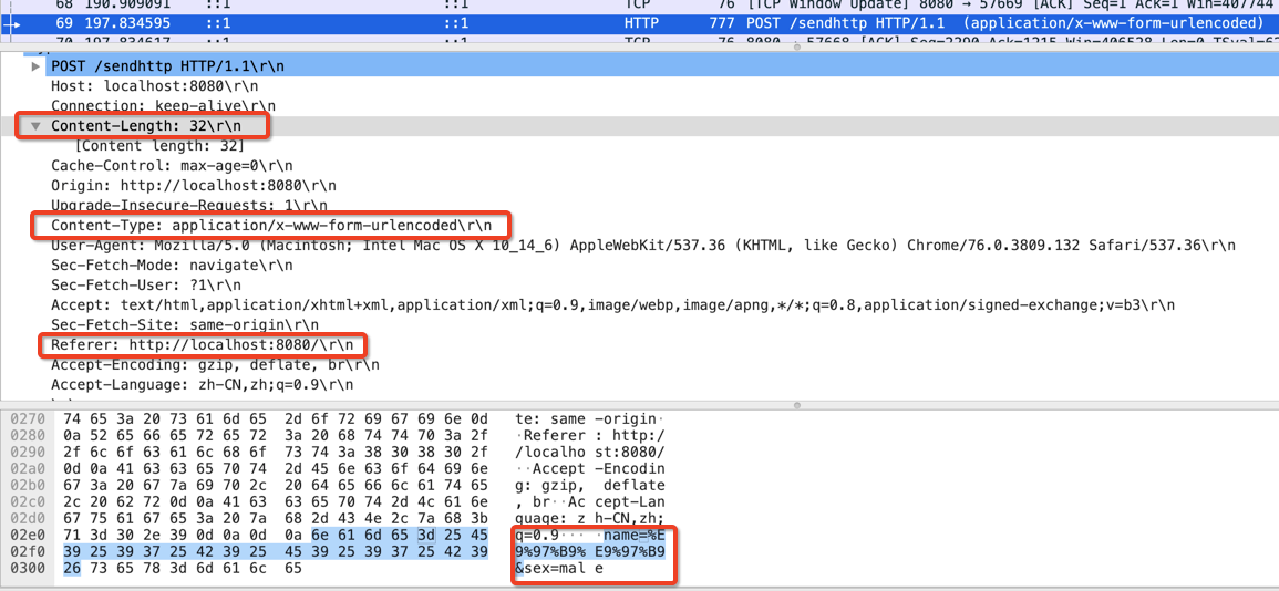 可以看到,跟GET提交相比,POST多了一个包体,点开Content-Length,我们可以看到请求的URI里已经没有参数了,并且Content-Type里展示了我们的内容编码方式