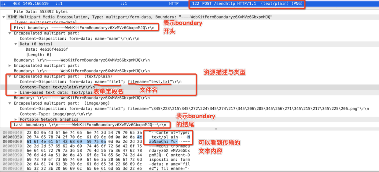 Content-Type来指明这是一个多表述包体,待会在wireshark中抓包我们就能看到