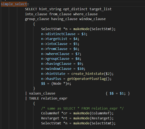 以SELECT查询为例,它对应了一个Statement结构体,这个结构体可以看作一个多叉树,每个叶子节点都表达了SELECT查询语句中的一个语法结构,对应到gram.y中,它会有一个SelectStmt,代码如图所示。