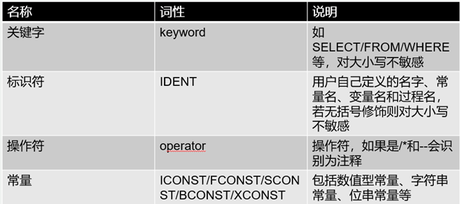 词法分析其实就是将一个SQL划分成多个不同的token,每个token会有自己的词性,在scan.l中定义了如下词性。