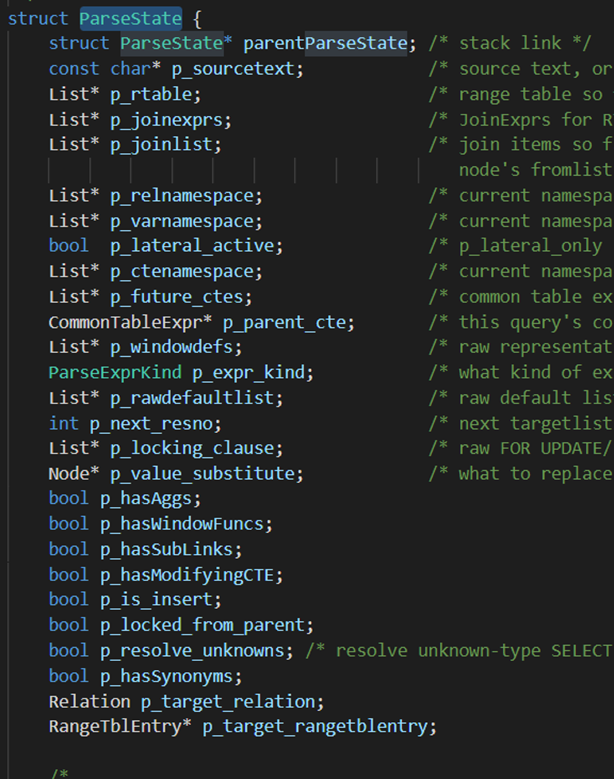 ParseState保存了许多语义分析的中间信息,如原始SQL命令、范围表、连接表达式、原始WINDOW子句、FOR UPDATE/FOR SHARE子句等。