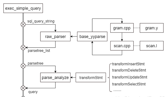 SQL解析对输入的SQL语句进行词法分析、语法分析、语义分析,获得查询解析树或者逻辑计划。SQL查询语句解析的解析器(parser)阶段包括如下: