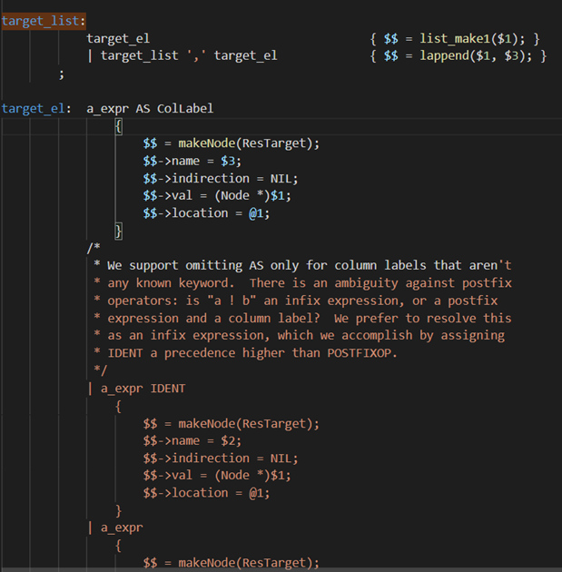 以目标属性为例分析,对应语法定义中的target_list,由若干个target_el组成。target_el可以定义为表达式、取别名的表达式和“*”等。当成功匹配到一个target_el后,会创建一个ResTarget结构体,用于存储目标对象的全部信息。代码如右图所示。