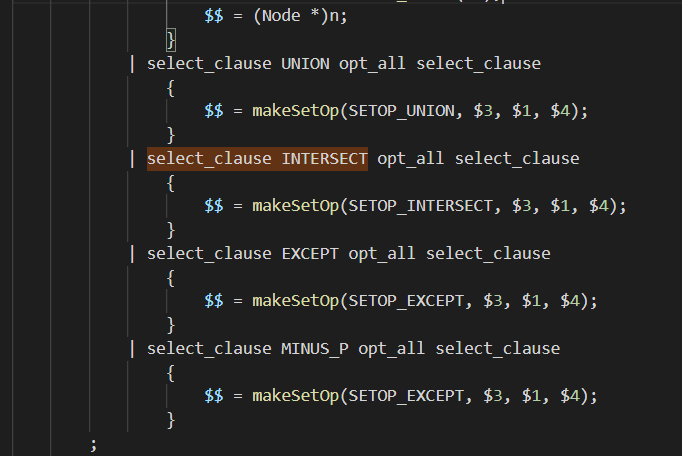 simple_select除了上面的基本形式,还可以表示为其他形式,如VALUES子句、关系表达式、多个SELECT语句的集合操作等,这些形式会进一步的递归处理,最终转换为基本的simple_select形式。代码如图所示。
