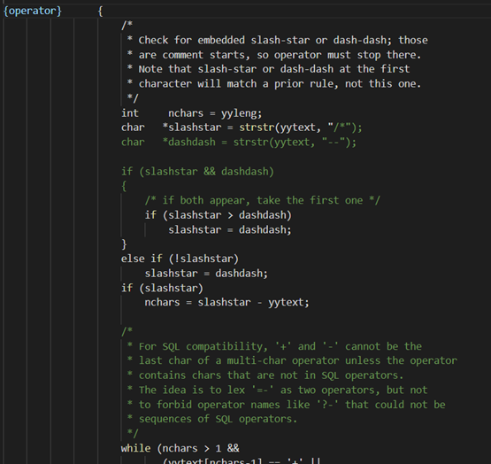 其中的operator即为操作符的定义,从代码中可以看出,operator是由多个op_chars组成的,而op_chars则是[~!@#^&|`?+-*/%<>=]中的任意一个符号。但这样的定义还不能满足SQL的词法分析的需要,因为并非多个op_chars的组合就能形成一个合法的操作符,因此在scan.l中会对操作符进行更明确的定义(或者说检查)。