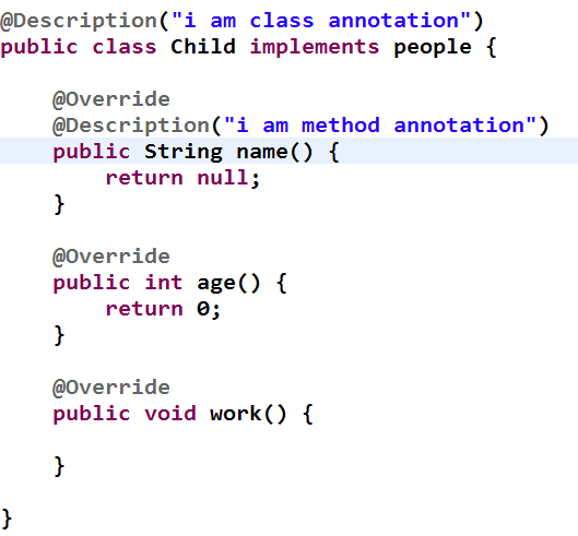 然后,我们回过头来看类people里面有一个work的方法。这里我们可以理解为人是要工作的,但是并不是所有的人都在工作,那么怎么办呢?如果说这个接口正在用,我们不能删除这个方法,这个时候我们就可以这样: