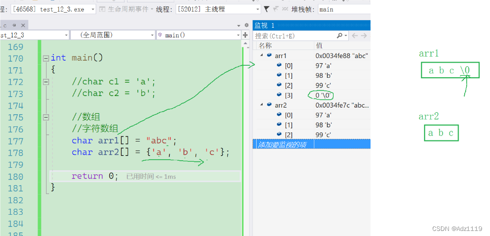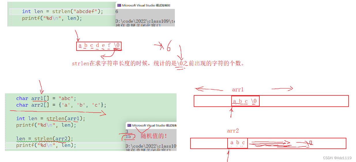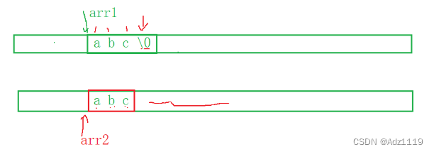 注意:只有字符串才有'\0'结束标志,像这样的字符数组就不是字符串char arr2[] = { 'a','b','c' };