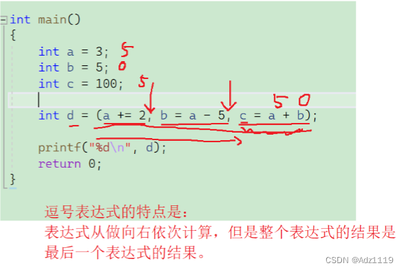 逗号表达式:表达式从左向右依次计算,整个表达式结果是最后一个表达式的结果