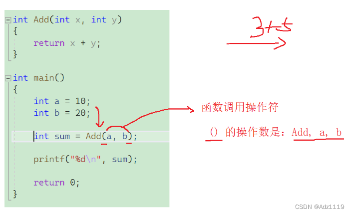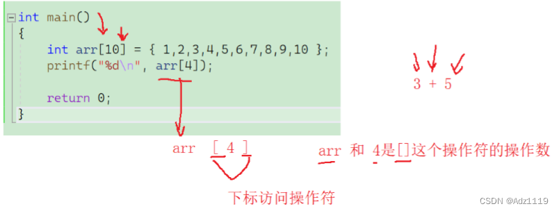 [ ]把arr和4结合在一起,让我们访问arr里面下标为4的元素,对[ ]下标引用操作符来说arr和4是它的操作数,操作符和运算符是一回事。