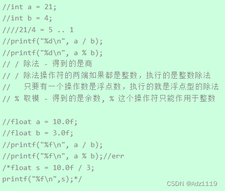 /两端都是整数,执行的是整数除法(10/3=3.....1),两端中只要有一个操作数是浮点数,执行的就是浮点数的除法(10/3=3.333333)
