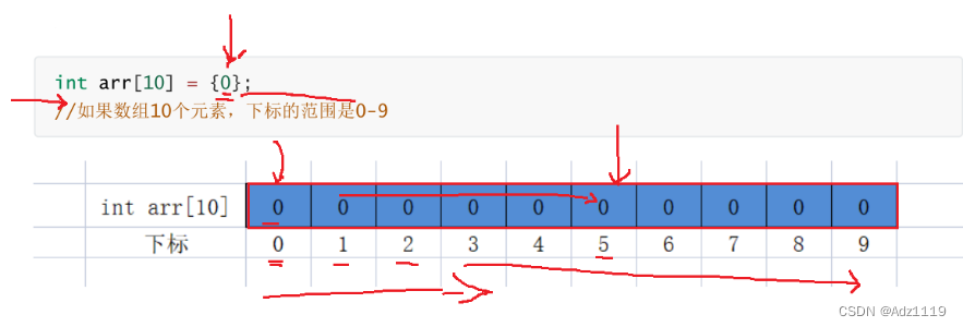 int arr[10]; arr是数组名,数组里面放了十个元素,每个元素是int类型