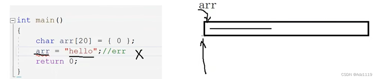 arr数组名本来就是首元素的地址,地址是个编号,把hello放到编号上吗,肯定不是,应该是把hello放在编号所指向的空间里面