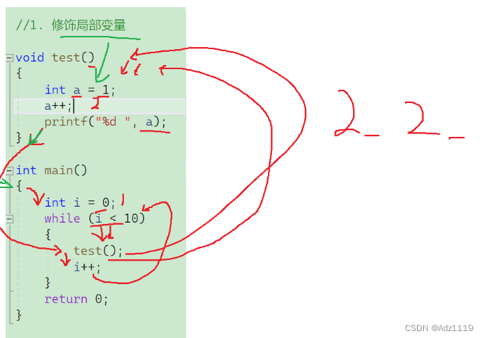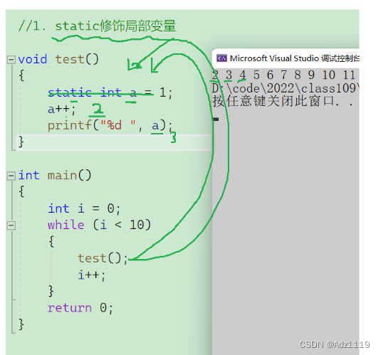 static修饰a,出了作用域之后a没有销毁,下次进去的时候a还在,在就不用再创建a了,通过调试可以看到static int a=1没有执行,被跳过去了。static修饰的a还是可以被修改的,只不过不会被重复创建