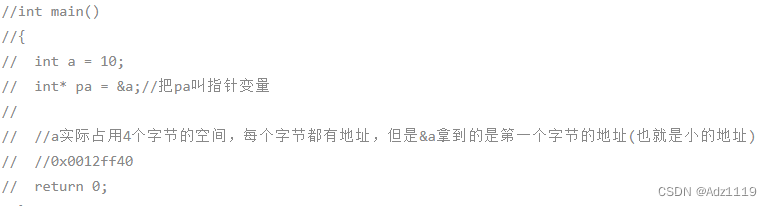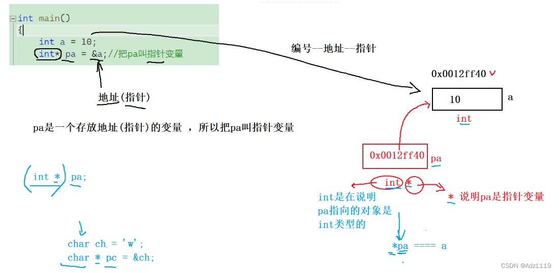 10是一个数值要存到a里面去,假设&a取到的是0x0012ff40,这也是个数值(不过是用十六进制表示),这个数值要存起来也得给它一块空间,就给个pa,pa的类型怎么写呢,应该是int*这样写,当我们看到pa前面是int*的时候,我们把pa叫做指针变量。*靠近int还是靠近pa没有明确规定,我们知道pa的类型是int*,理解的时候这个*代表pa是指针变量