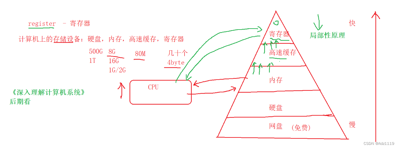 数据都是由CPU处理的,数据哪里来呢,早期是从内存里面拿的,处理完再把数据放回内存里面去,如果CPU的处理速度和内存的读写速度比较搭配那还是挺好的,但是随着技术的提升CPU的处理速度越来越快,但是硬件的读写速度没有这么快,这时候就出现问题了,从内存拿个数据,拿了半天才拿到CPU,CPU马上就处理完了,两者效率严重不匹配,这时候就想找一些更快的存储设备,然后CPU直接去寄存器拿数据,当从寄存器拿数据,正在用某一部分的数据的时候,把高速缓存里的数据往寄存器其他位置上挪,把内存中数据往高速缓存上挪,不断把寄存器里的数据进行替换,只要能保证大概率都在寄存器里面把数据都找到,CPU去拿数据都会有,整体的读写速度就提升上来了。从经济成本考虑,又要为了提升计算机整体的处理速度,然后就衍生出来金字塔型的存储结构