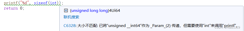sizeof返回值是size_t,想要消除警告可以用%zd接收