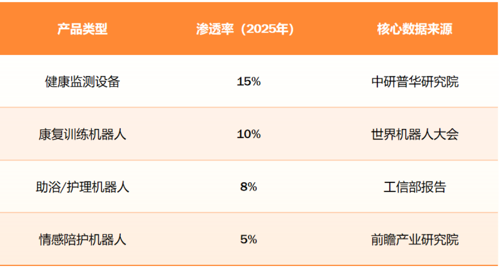 根据铅笔道研究院测算,2025年智能养老机器人的整体渗透率约为8%。具体来看,康复类养老机器人以45%市占率稳居第一,而情感陪伴类机器人年增速最快,达到了120%,每个细分赛道上都有众多的机会涌现。