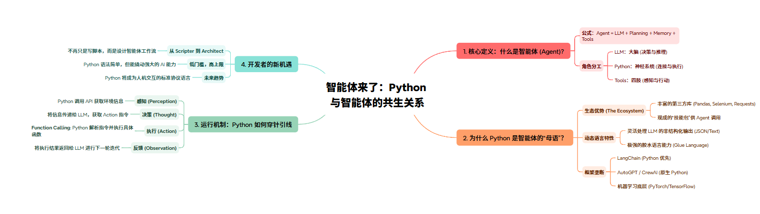 在这个从“纯数字世界”向“真实物理/数字世界”跨越的过程中,Python 扮演了什么角色?答案很简单:它是智能体的母语,也是它的神经系统。