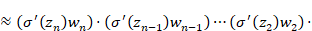 多个小于1的数相乘,随着网络层数的加深,这个连乘项会变得极小,导致整体梯度消失。