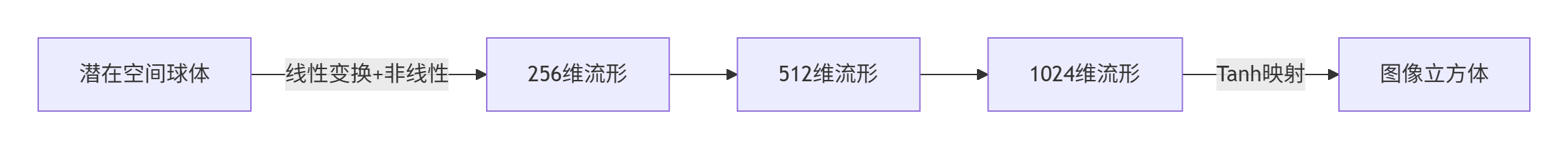 输入:一个随机的噪声,通常就是一个标准正态分布的信号采样而来,这个向量所在的N维空间被称为潜在空间 (Latent Space)。这个随机噪声是创造力的来源,不同的噪声向量会生成不同的图像。这个向量通常就是一维的,比如100维,就是在一个正态分布里面随机采集100个数字。