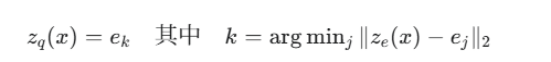 这里的 ze(x) 是编码器的输出,而 ej 是码本中的第 j 个向量。我们找到距离 ze(x) 最近的那个 ej 并将其作为量化后的向量 zq(x) 传递给解码器。这个过程就像查字典,将一个连续的、可能有些模糊的“意思”(ze(x))映射到字典里最接近的那个标准“词条”(ek)。