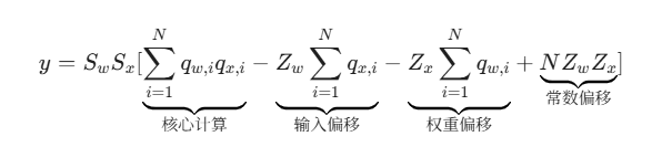 量化 GEMM 公式: 通过数学展开,将浮点点积转化为整数点积 + 修正项。