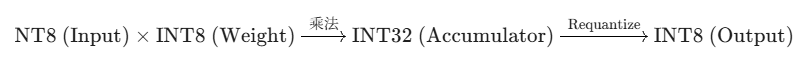 注意最后一步:累加完的结果是 INT32,但下一层的输入需要 INT8。所以我们需要把这个 INT32 的结果再次量化(Requantize)回 INT8。