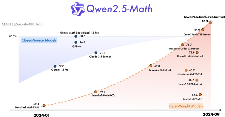 这些改进使得Qwen2.5-Math在数学推理上显著超越前代和当前开源模型,甚至在某些基准上超过闭源模型如GPT-4o。
