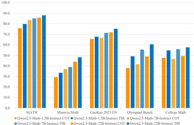 TIR模式:借助Python解释器,72B模型在MATH上接近90分,1.5B模型也达80分,验证工具提升计算准确性。