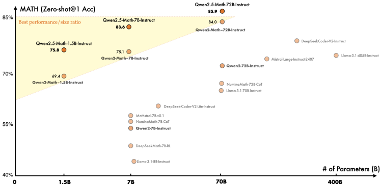 基础模型:Qwen2.5-Math基础模型在MATH上达到66.8分(72B),创下新SOTA。即使1.5B模型也超越多数同规模模型。