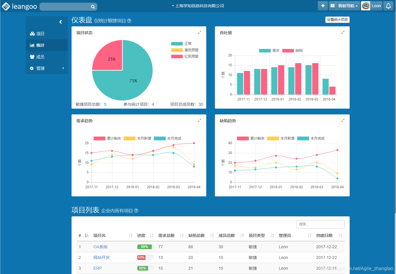 6.在领导层面,可以更多的看到整个项目的一些进度,包括缺陷和需求以及成员的一些进展情况
