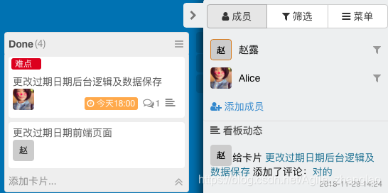 2.Leangoo看板上是以拖拽的方式将成员拖拽至任务卡片上,也可以为每一张卡片添加截止日期