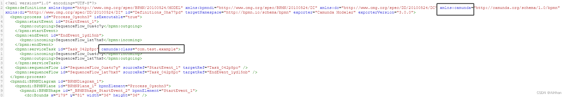 3、创建好bpmn文件后,开始部署,我流程中引用了 serviceTask模块 ,提示:[Validation set: 'flowable-executable-process' | Problem: 'flowable-servicetask-missing-implementation'] : One of the attributes 'class', 'delegateExpression', 'type', 'operation', or 'expression' is mandatory on serviceTask. 根据异常报错可以看出是因为在serviceTask模块里面必须包含 "class","delegateExpression","type","operation","expression"其中任何一个,不然就会抛出错误信息。但是我看xml文件,已经对class定义了。经过一番折腾,原来是跟Camunda Modeler有关系,我是通过Camunda Modeler构建的流程文件,在文件的顶部(如下图) xmlns:camunda="http://camunda.org/schema/1.0/bpmn",把它改为 xmlns:activiti="http://activiti.org/bpmn" ,文件中的camunda:class 改为 activiti:class,然后导入部署成功!