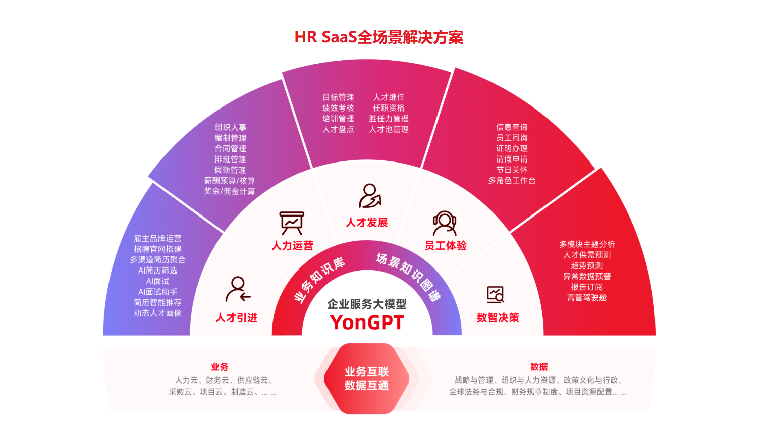 面对行业痛点,用友新一代 HR SaaS 提出系统性解决方案,以 “数字赋能 业人融合” 为核心价值主张,构建起全方位的产品体系与技术能力: