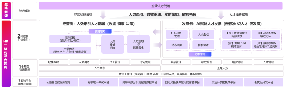 - 发展侧:打造动态人才供应链,评估人才能力与潜力,提升组织整体效能。