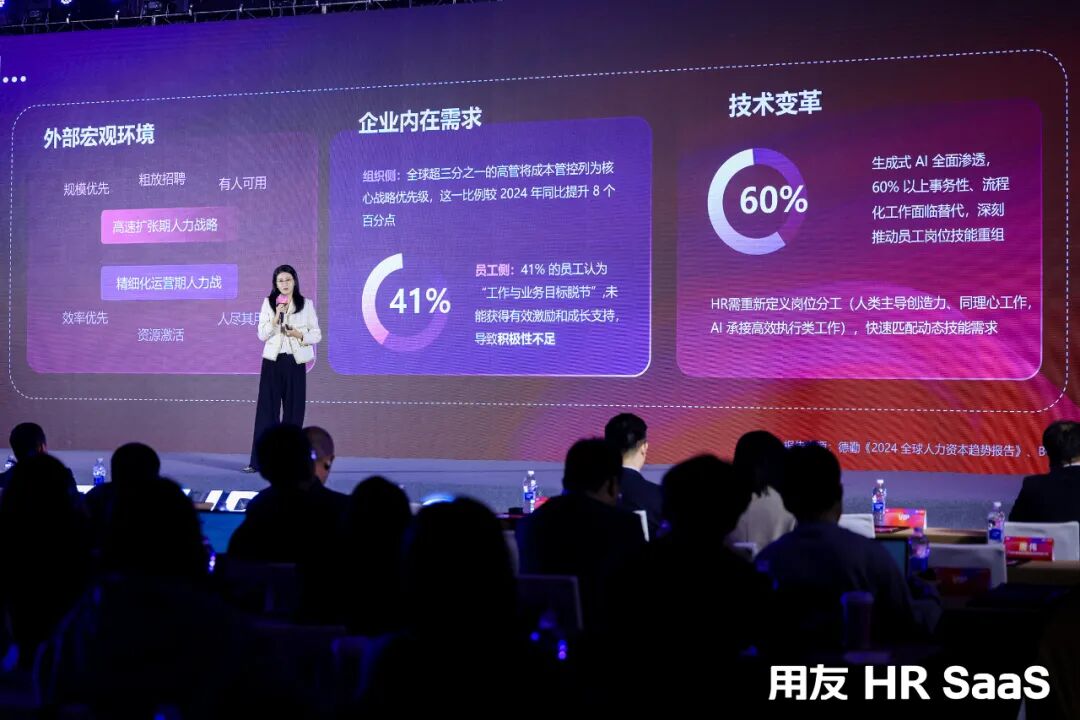 依托用友企业服务大模型,HR SaaS 已打通人才、业务、财务等全域数据,打造 9 个智能体,在近 50 个场景植入深度 AI 能力,涵盖招聘、绩效、培训、员工关系等核心维度。从自动化事务处理到智能决策支持,AI 技术正推动人力资源管理向智能化、自动化全面升级。