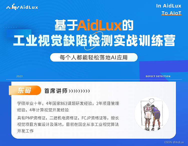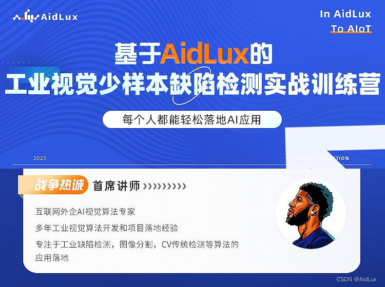 课程内容包括工业视觉缺陷检测概述和项目实战案例,工业视觉缺陷检测实战流程,通过AidLux进行项目部署落地。