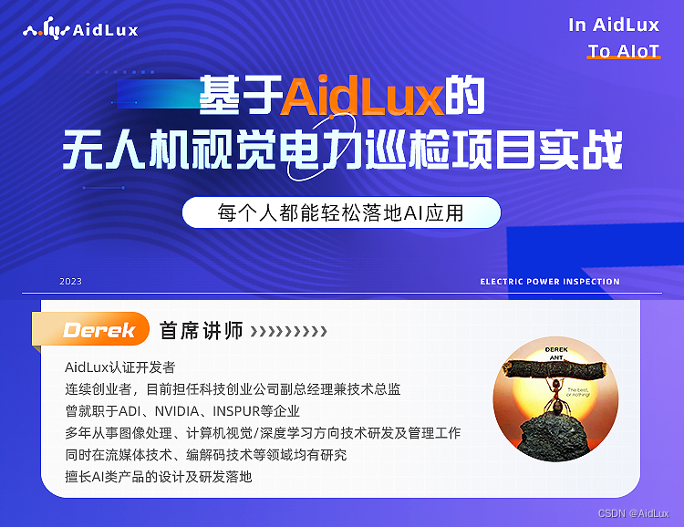 课程内容包括电力巡检及AidLux相关方案介绍、基于可见光的巡检及AidLux工程方案、基于热成像的巡检及AidLux工程方案、可见光巡检中的目标锁定等等。