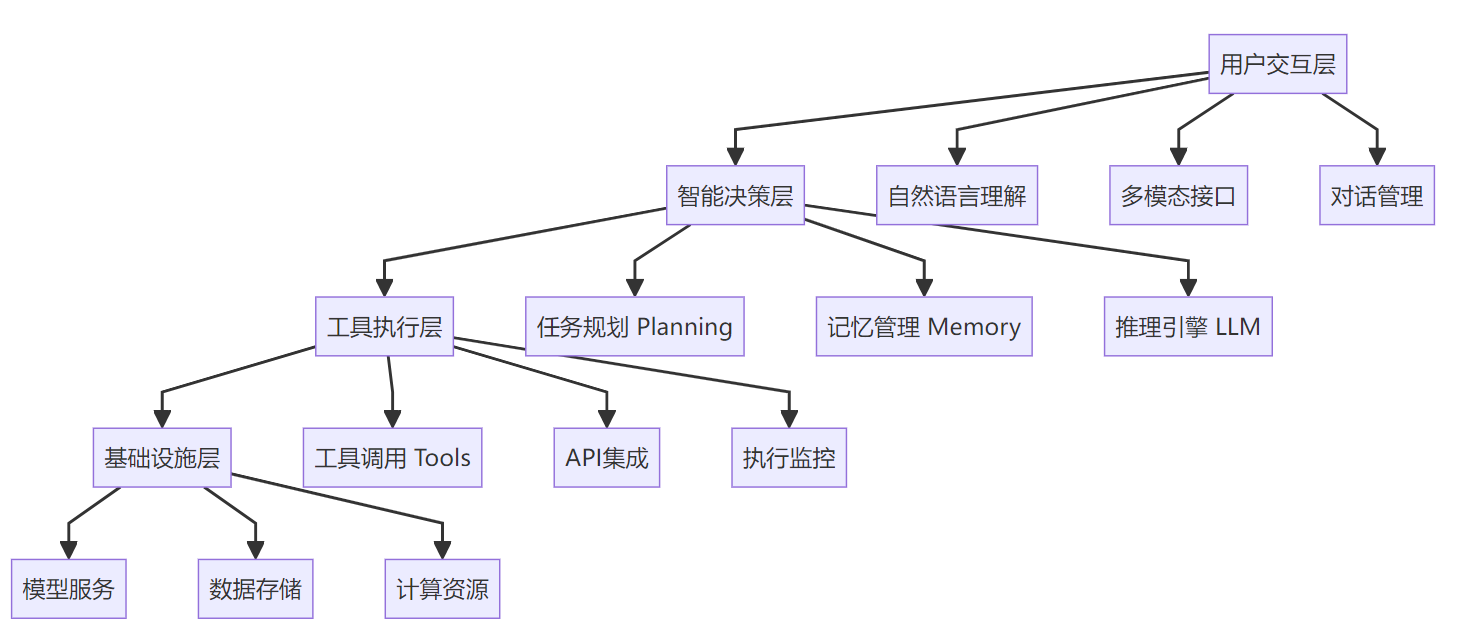 智能决策层:Agent的"大脑",包含任务规划、记忆管理和推理引擎。这里的技术难点是如何让Agent具备类人的推理和规划能力。
