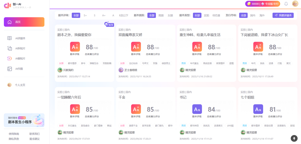 这种短剧创作模式,就算是有能力的编剧,也很容易被流程问题卡住,而创一AI则致力于为关键环节提供智能辅助——从“剧本评估优化”—“学爆款”—“投剧本”,用短剧剧本工具来提升核心环节的效率,比如短剧编剧可以用AI拆短片工具看类似爆款的分镜拉片,写完了之后做做短剧剧本评估、直接投稿,不用再转多个渠道或工具,这就是“全流程伙伴”的价值:让编剧只用心写创作本身,不用被流程所累。