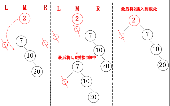 初始情况,L和R树是“空节点”,M是整棵树,现在需要我们一步一步拆分,当我们将“节点2”试插入到“节点7”的左孩子时,发现“节点7”